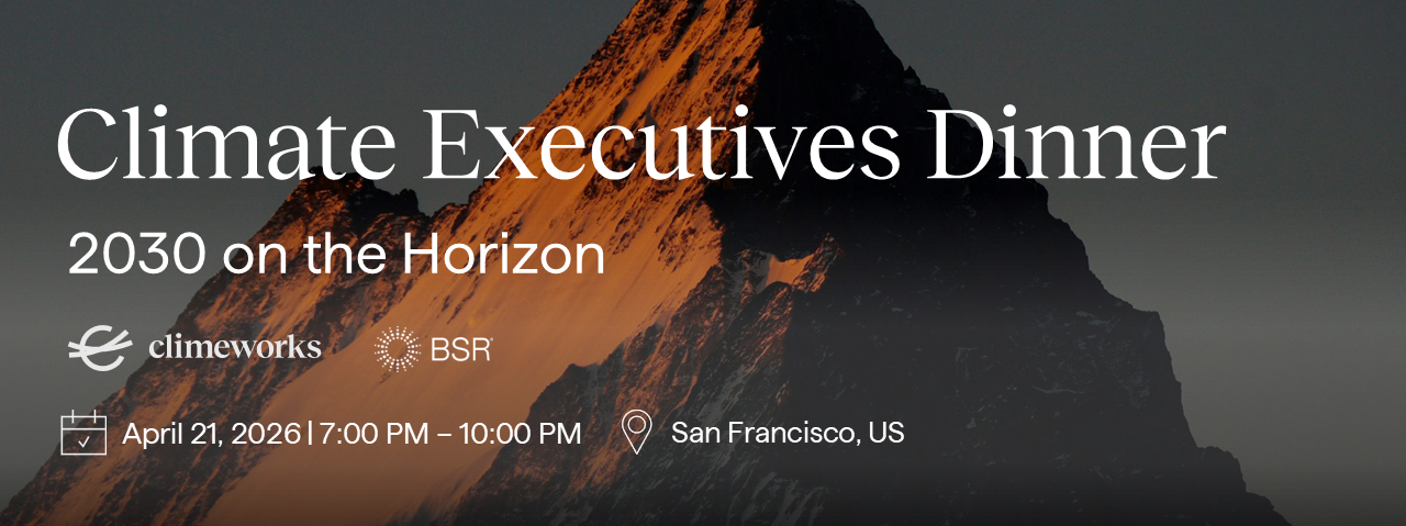 Climeworks and BSR invite you to an executive‑level gathering during San Francisco Climate Week: the Climate Executives Dinner: 2030 on the Horizon, taking place on April 21, 2026, from 7:00 PM–10:00 PM in San Francisco near Fisherman’s Wharf.
